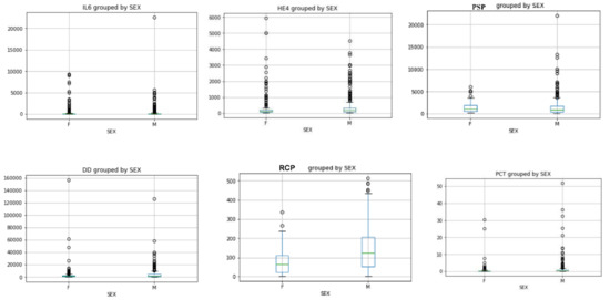 IL-6 and He4 sex distributions showed an increase in females compared to males; PSP, D-Dimer, RCP and PCT sex distributions showed an increase in males compared to females (Mann Whitney U test p < 0.05).