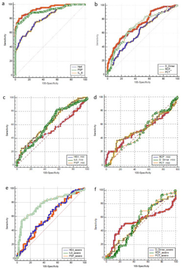 Area under curve/AUC) of considered biomarkers: in all patients (a) excellent accuracy for He4 (AUC = 0.92), IL-6 (AUC = 0.91), and very good accuracy for PSP (AUC = 0.81); (b) good accuracy for PCT (AUC = 0.701) and D-Dimer (AUC = 0.721), sufficient accuracy for RCP (AUC = 0.616); in mild patients (c) excellent accuracy for He4 (AUC = 0.978), IL-6 (AUC = 0.96), very good accuracy for PSP (AUC = 0.873); (d) good accuracy for RCP (AUC = 0.705), D-Dimer (AUC = 0.753); sufficient accuracy for PCT (AUC = 0.622); in severe patients (e) very good accuracy for He4 (AUC = 0.897), IL-6 (AUC = 0.851), good accuracy for PSP (AUC = 0.738); (f) a sufficent accuracy for PCT (AUC = 0.622) and D-Dimer (AUC = 0.6.83); a bad accuracy for RCP (AUC = 0.513).