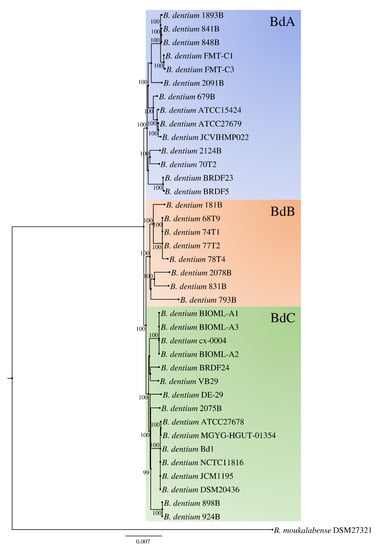 3.3. Phylogenetic Analyses and Evolutionary Development of the B. dentium Taxon