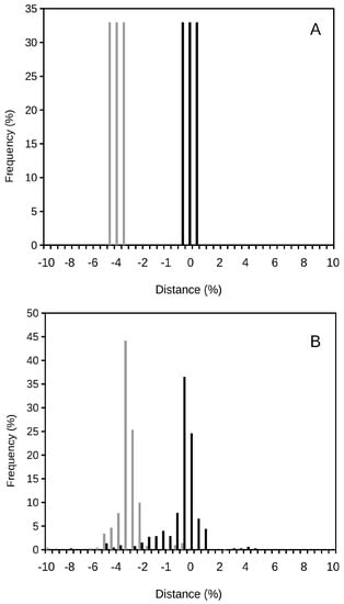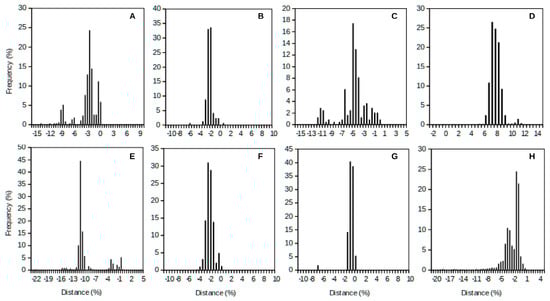 Eight additional examples showing the plots of the frequency distribution versus distance to the type strain of each species. The analysis was carried out for the species: Bacillus subtilis (A), Bacteroides fragilis (B), Clostridium botulinum (C), Helicobacter pylori (D), Rhizobium leguminosarum (E), Streptococcus pyogenes (F), Sulfolobus acidocaldarius (G), and Vibrio cholerae (H). The displacement of the main peak to one of the sides, away from zero distance, might suggest that a better reference (i.e., type strain) should be established. Distance represents the percentage of dissimilarity against the reference genome.
