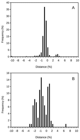 The method used to analyze the example species shown in this study is as follows. The genome sequences available for the analyzed species were retrieved from the National Center of Biotechnology Information (NCBI) Microbial Genomes database (https://www.ncbi.nlm.nih.gov/genome/browse#!/prokaryotes/). For each species, its type strain was selected as the reference organism except if noted otherwise. Within a species, the genomes were pairwise compared to the reference strain and the genomic distance (% dissimilarity) was calculated based on the average nucleotide identity (ANI) as described by Richter and Rosselló-Móra [1]. Briefly, query genomes were divided into 500 nucleotide fragments, which were used to search against the whole genome sequence of the reference genome using the blastn algorithm [31]. ANI was estimated, as the average of the genome fragments, by the percentage of identity (resulting from blastn) times the aligned sequence length divided by fragment length for the genome fragments. Genomic distance was expressed as the percentage of dissimilarity (100-ANI) between query and reference genome, with the type strain showing zero dissimilarity (i.e., it was identical) to itself. For each species, the frequency distribution of those dissimilarities was calculated using a standard office-ware spreadsheet. The Supplementary Material (Table S1) shows the list of the example species analyzed in this study, the type strains, and the number of genomes available at NCBI for each species.