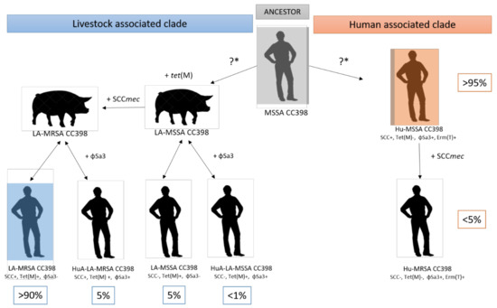 Schematic representation of the evolution of different subpopulations within the CC398 lineage. The last common ancestor of Staphylococcus aureus (SA) CC398 was probably a human-adapted immune evasion cluster (IEC)-positive methicillin-susceptible SA (MSSA) CC398 strain, which at a later stage acquired SCCmec, leading to the emergence of human methicillin-resistant SA (MRSA) CC398 strains. At some point, the ancestral MSSA CC398 strain jumped to livestock, which was accompanied by the loss of IEC and the acquisition of tet(M), conferring resistance to tetracycline and later on by the acquisition of SCCmec, conferring resistance to methicillin, leading to the emergence of livestock-associated MRSA CC398. However, Ward et al. [14] supported the existence of distinct human- and livestock-associated clades that emerged at similar times, which was represented by “?*” in the figure. Because some interspecies transmission in both directions was described, a double-arrow was used to represent the different livestock-associated clade subpopulations. These transmissions were probably responsible for the acquisition of the prophage φSa3 in the LA clade, which differentiated human (Hu) SA CC398 subpopulations from the adapted Humans (HuA) livestock-associated (LA) SA CC398 subpopulations.