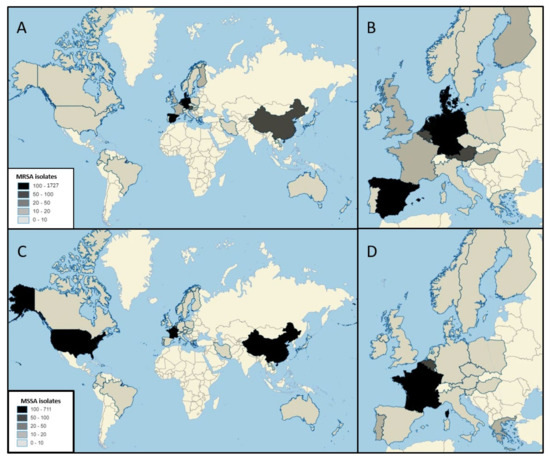 Number of MRSA (A,B) and MSSA (C,D) CC398 isolates from clinical infection in the world and in Europe. MRSA: Denmark (n = 1727), Germany (n = 600), The Netherlands (n = 446), Spain (n = 310), China (n = 78), Belgium (n = 77), Austria (n = 67), Sweden (n = 2), Slovenia (n = 6), France (n = 18), Luxembourg (n = 16), United Kingdom (n = 14), Hungary (n = 12), Finland (n = 10), New Zealand (n = 7), Italy (n = 6), Greece (n = 4), Canada (n = 4), United States (n = 3), Japan (n = 2), Hong Kong (n = 2) Laos (n = 1), Japan (n = 1), Australia (n = 1), Norway (n = 1), Ireland (n = 1), Poland (n = 1); MSSA: France (n = 711), China (n = 255), United States (n = 117), Belgium (n = 58), Portugal (n = 18), Greece (n = 17), The Netherlands (n = 7), Dominican Republic (n = 7), Iran (n = 6), Germany (n = 6), Spain (n = 4), Denmark (n = 4), Laos (n = 4), Ireland (n = 2), Colombia (n = 2), Italy (n = 1), Ecuador (n = 1), Brazil (n = 1).