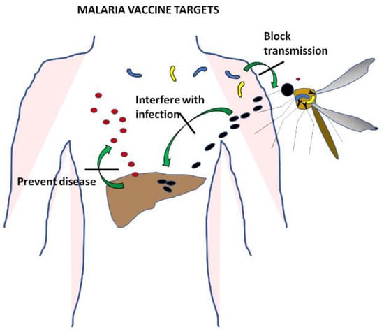Malaria is a complex infectious disease caused by five different species of Plasmodium parasites. Plasmodium vivax and Plasmodium falciparum are the most common, though their distribution around the world does not completely overlap. Plasmodium vivax and Plasmodium ovale form hypnozoites, latent hepatic forms that are difficult to clear and constitute a reservoir of parasites that maintains the infection in the population. Plasmodium knowlesi has a shorter life cycle and as a consequence a very quick onset of clinical symptoms. The most severe disease is caused by Plasmodium falciparum, and much effort has been devoted over decades of research to the development of a vaccine specific to this species [2]. All stages of the parasite in the human host have been targeted (Figure 1) with the aim of designing vaccines that prevent infection by directing the immune response to the sporozoites, that avoid clinical symptoms and the spread of disease by using the antigens expressed during the blood cycle, or that stop transmission by targeting gametocytes.