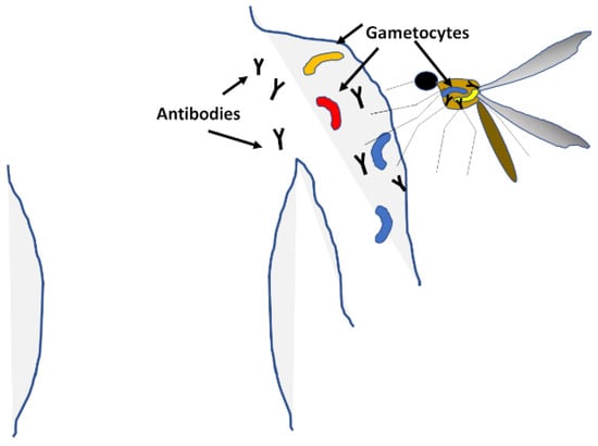 Gametocytes differentiate in the blood when infection is high or the health of the human host deteriorates, putting in jeopardy the survival of the parasite (Figure 4). Female and male stages are taken by the mosquito during the blood meal, which mate in the mosquito to form a zygote, and it is at this point that genetic recombination can happen [122]. The development in the mosquito culminates with the formation of sporozoites that migrate to the salivary glands and are deposited in the next human host during the mosquito’s next blood meal [123]. Vaccines targeting the gametocyte stage aim at reducing or stopping the transmission of malaria from one person to the next, rather than preventing clinical disease in any one person. Interruption of transmission has been proven many times throughout the history of the battle with malaria to be very effective at reducing the overall burden of the disease; these include the fumigations in 40 s–60 s to reduce mosquito populations, and more recently the introduction of insecticide-impregnated bednets to prevent mosquito bites. However, these initiatives proved to have complications, such as the toxicity of the insecticides, the resistance of the mosquitoes to them and changes in mosquito behaviour to diurnal habits. Targeting the gametocytes is one potential avenue to stop transmission and lower the burden of malaria in communities.