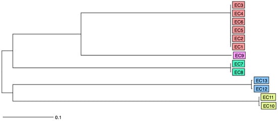 Neighbor-joining tree representing the whole-genome multi locus sequence type (wgMLST) analysis of the different E. coli isolates included in the study. Isolates belonging to the same clonal clusters are represented in the identical colors.