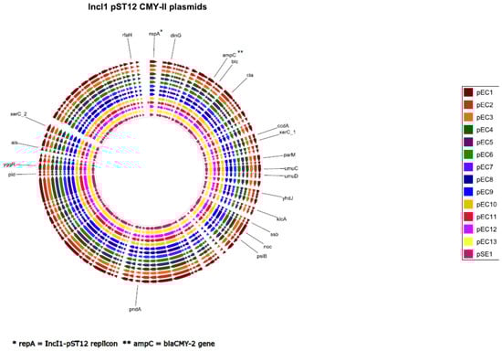- Accogli, M.; Fortini, D.; Giufrè, M.; Graziani, C.; Dolejska, M.; Carattoli, A.; Cerquetti, M. IncI1 plasmids associated with the spread of CMY-2, CTX-M-1 and SHV-12 in Escherichia coli of animal and human origin. Clin. Microbiol. Infect. 2013, 19, E238–E240. [Google Scholar] [CrossRef][Green Version]
