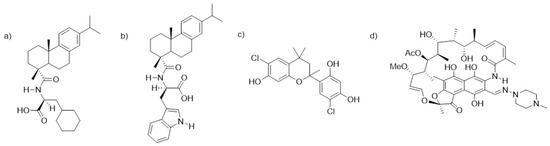 Chemical structures of the two dehydroabietic acid (DHA) derivatives, (a) N-(abiet-8,11,13-trien-18-oyl)cyclohexyl-L-alanine, (b) N-(abiet-8,11,13-trien-18-oyl)-D-tryptophan, coded DHA1 and DHA2, the flavan derivative, (c) 6-chloro-4-(6-chloro-7-hydroxy-2,4,4-trimethylchroman-2-yl)benzene-1,3-diol, coded FLA1, and (d) rifampicin, coded RIF.