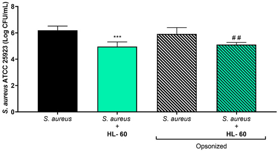 Viable counts of adhered opsonized and nonopsonized S. aureus ATCC 25923 on titanium coupons after coculture with HL-60 cells for 24 h. The left half of the graph includes the nonopsonized S. aureus ATCC 25923 biofilm formation, in absence (black column) or cocultured with HL-60 cells (green column). The right half includes the opsonized S. aureus ATCC 25923 biofilm formation, in absence (white/black column) or cocultured with HL-60 cells (green/black column). “*” indicates statistical differences with the nonopsonized S. aureus ATCC 25923 in monoculture, while “#” represents statistical differences with the opsonized S. aureus ATCC 25923 in monoculture with Welch’s unpaired t-test (*** p < 0.001; ## p < 0.01). Values are means and SD of three independent experiments.