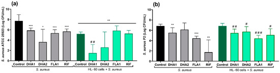 The right part of Figure 4a (green bars) corresponds to the same experiments performed in the presence of HL-60 cells. Under such conditions, there was also a significant reduction of the attached viable S. aureus ATCC 25923 when compared with the material incubated without HL-60 cells (green control bar versus black control bar, p < 0.001). Moreover, this reduction was further increased by compound DHA1 (p = 0.025 when comparing the coculture control column with the DHA1 column in the HL-60 cells + S. aureus ATCC 25923 section of Figure 4, and p < 0.001 when comparing the DHA1 gray column with the DHA1 green column). The same tendency was observed for DHA2, but no statistical differences were found when comparing this to the control (dark green control: HL-60 cells + S. aureus ATCC 25923 section of Figure 4). Despite the fact that FLA1 and the model antibiotic (RIF) successfully prevented the adhesion of S. aureus ATCC 25923, they did not cause a further increase in the bacterial clearance activity of the HL-60 cells. In contrast, the mere presence of HL-60 cells did not result in a significant reduction of S. aureus P2 attachment (Figure 4b), since no differences were found between the S. aureus P2 control in monoculture and in coculture with HL-60 cells. In this case, no differences were found between the antibacterial effects of the compounds in monoculture when compared with the same treatment in coculture with HL-60 cells (DHA1, DHA2, FLA1, and RIF gray columns versus their corresponding green columns).