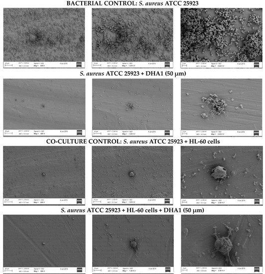Representative images acquired by SEM. From left to right the same section of the titanium coupon is shown with different magnification, 500, 1000 and 3000×. Upper row of images, bacterial control, i.e., coupons incubated with S. aureus ATCC 25923 only. Second row, titanium coupons incubated with S. aureus ATCC 25923 and treated with DHA1. Third row, cocultured control, titanium coupons incubated with S. aureus ATCC 25923 and HL-60 cells simultaneously. Fourth row, titanium coupons cocultured with S. aureus ATCC 25923 and HL-60 and treated with DHA1.