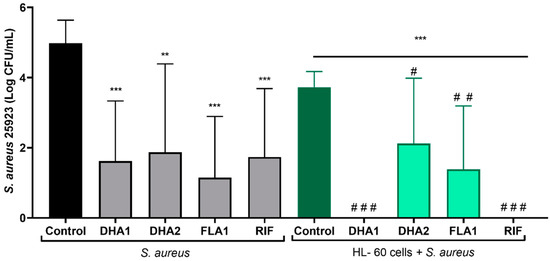 Viable counts of adhered S. aureus ATCC 25923 on LDPE tubes exposed to different antimicrobial compounds (tested at 50 µM) after 24 h of incubation. The gray bars show the attached viable bacteria when exposed just to the antimicrobial compounds, while the green bars show the results when S. aureus strains were cocultured with HL-60 cells. “*” indicates statistical differences with the control in monoculture, while “#” represents statistical differences with the control in cocultured controls with Welch’s unpaired t-test (** p < 0.01; *** p < 0.001)/(# p < 0.05; ## p < 0.01; ### p < 0.001). Values are means and SD of three independent experiments.
