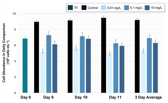Treatment and control tanks were sampled after 9, 10, and 11 days. Experiments started with ~680,000 cells/mL in all tanks. There are differences between the growth rate in the different treatments, but the ratio stays the same over all three sampling days. The cell density in the control was 9.83 ± 0.39 × 105 cells per mL, while treatment tanks were significantly lower: 0.01 mg/mL: 5.69 ± 0.12 × 105 cells per mL, 0.1 mg/mL: 7.51 ± 0.34 × 105 cells per mL, and 10 mg/mL: 6.96 ± 0.40 × 105 cells per mL. Bars display a confidence interval.