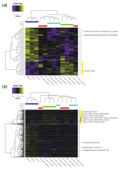 Heatmap and clustering of differentially expressed genes (2-fold changes, p < 0.001) between dinoflagellates exposed to nano-plastics and controls. (a) DEGs in Symbiodinium tridacnidorum. (b) DEGs in Cladocopium sp. Values indicate the relative gene expression level with purple and yellow showing downregulation and upregulation, respectively. The yellow bar shows a cluster of upregulated genes. Annotations by Blast2GO show the presence of microtubule-related or photosynthesis-related genes among DEGs.