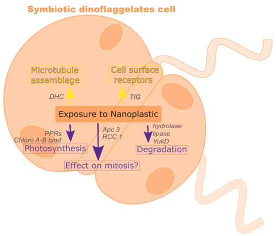 Other downregulated gene groups were related to intracellular degradation processes, including hydrolase and lipase, and to subunit 3 of the anaphase-promoting complex/cyclosome [45]. The downregulated gene (s3282_g2) with abhydrolase and chlorophyllase domains is likely related to chlorophyll degradation [46]. The gene, s576_g21, for cell division control (CDC) protein 2 is downregulated in Cladocopium. Downregulation of six genes with RCC1 (regulator of chromosome condensation) and three genes with CDC domains suggest some effect on cell division. Thus, several negative consequences of nanoPS42 exposure are suggested by DEGs (summarized in Figure 5).