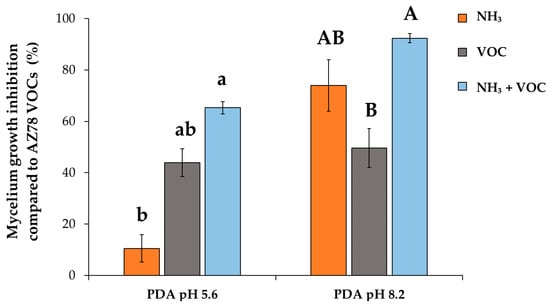 Inhibitory effect caused by multiple factors. Data presented as mean ± standard error of five replicates. Different letters indicate significant differences among treatments according to the Games-Howell test (p ≤ 0.05) in the case of PDA with pH 5.6 and to the Tukey’s HSD test (p ≤ 0.05) in the case of PDA with pH 8.2.