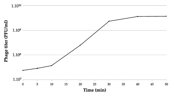8 CFU/mL). Phages were added to the bacterial suspension at an MOI of 0.01 and were allowed to adsorb for 10 min at 25 °C. Next, the mixture was washed with an equal volume of LBS. This manipulation was repeated three times to remove any free phage particles. After centrifugation, the pellet cells were resuspended in 1 mL of LBS and 10 µL of this culture was added to 10 mL of LBS and incubated for 2 h at 25 °C while shaking. During the incubation, samples were taken at 5 to 10 min intervals and immediately diluted, after which the dilution was plated on levan agar to determine the phage titer. The burst size was calculated as the ratio of the final phage titer to the initial number of infected bacterial cells during the latent period [