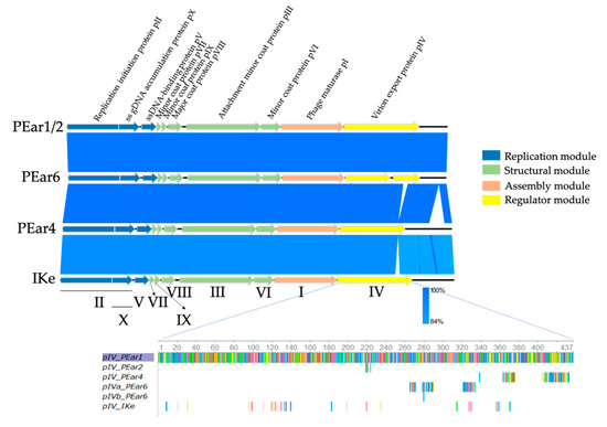 As is the case with all Inoviridae, the PEar genomes are a single-stranded DNA molecule that is converted to a double-stranded replicative form in the host cell, which can be recovered as a plasmid. The PEar phages display a modular genome organization, like that of previously described filamentous phages IKe, Fd or M13. The following four usual modules of filamentous phages are also distinguishable in the PEar phages: the replication module, the structural module, the assembly module and the regulator module.