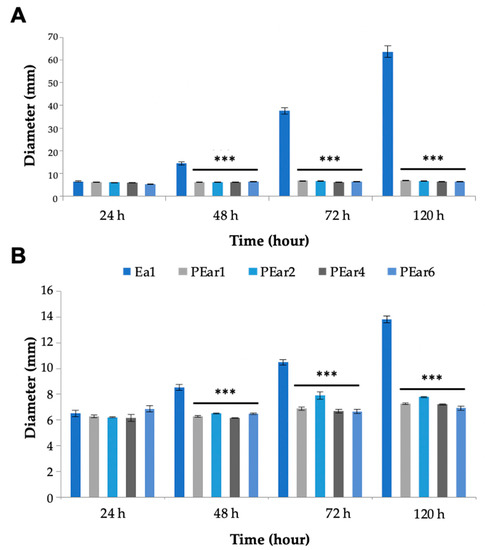 Figure 4A). Similarly, the swarming motility of the strain infected with the bacteriophages was about 50% less compared to the uninfected Ea1 (