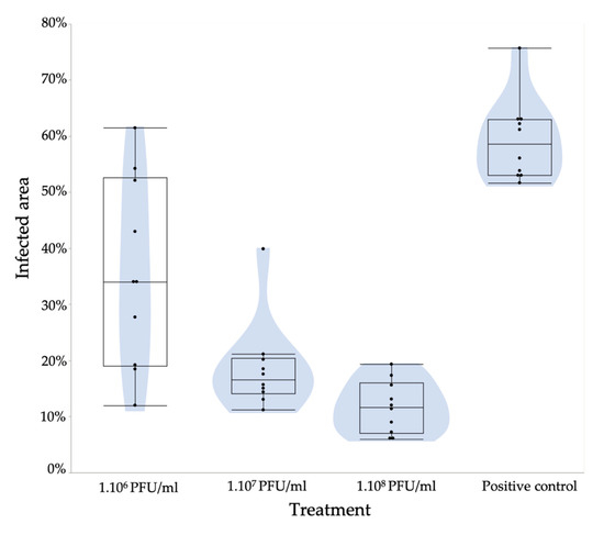 The different filamentous phages alone as monotreatment had a rather limited effect on the growth reduction of E. amylovora on pear slices. However, the combination of all phages reduced symptom development by 40% (106 PFU/mL) compared to the positive control (108 CFU/mL).