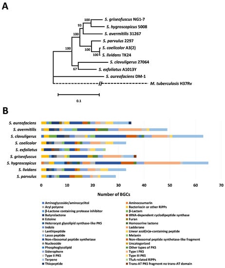 Relative phylogeny and BGC content of Streptomyces spp. used in the current study. (A) Maximum likelihood tree of the respective Streptomyces spp. based on five concatenated housekeeping genes: atpD, gyrB, recA, rpoB and trpD. Bootstrap values were calculated using 100 replicates and Mycobacterium tuberculosis served as an outgroup. The percentage of trees in which the species clustered together is shown next to the branches. The tree is drawn to scale, with branch lengths measured in the number of substitutions per site. (B) Predicted BGC numbers and their respective classes (listed below) as per antiSMASH.