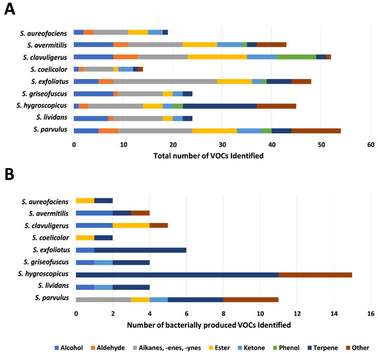 Identified volatile organic compounds (VOC) grouped according to functional classes. (A) Total identified VOCs attributed to bacterial origin and those derived from the media. (B) Identified VOCs of bacterial origin only.