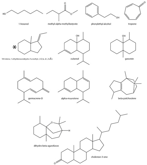 - Schulz, S.; Dickschat, J.S. Bacterial volatiles: The smell of small organisms. Nat. Prod. Rep. 2007, 24, 814–842. [Google Scholar] [CrossRef]