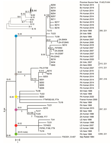 - Johansson, A.; Farlow, J.; Larsson, P.; Dukerich, M.; Chambers, E.; Bystrom, M.; Fox, J.; Chu, M.; Forsman, M.; Sjostedt, A.; et al. Worldwide Genetic Relationships among Francisella tularensis Isolates Determined by Multiple-Locus Variable-Number Tandem Repeat Analysis. J. Bacteriol. 2004, 186, 5808–5818. [Google Scholar] [CrossRef] [PubMed]