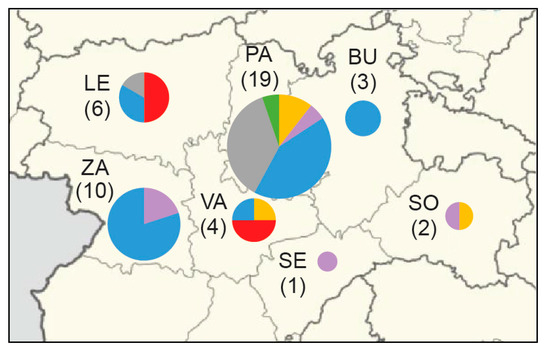 Phylogeography of 45 F. tularensis strains with a known place of isolation in seven Spanish provinces from 1998 to 2020. Major phylogenetic clades are labelled by colors corresponding to Figure 1. Province labels are Burgos (BU), León (LE), Palencia (PA), Segovia (SE), Soria (SO), Valladolid (VA), and Zamora (ZA). The number of genomes is within round brackets.