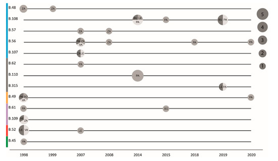 The phylogeography of six major clades including 45 F. tularensis strains with a known place of isolation in seven Spanish provinces is shown in Figure 3. The total diversity at the clade level and their spatiotemporal distribution is illustrated in Figure 1 and Figure 4. Most strains and the largest genetic diversity were from the province of Palencia. We found that F. tularensis strains belonging to two distinct clades, B.108 and B.110, caused the 2014–2015 human tularemia outbreaks in Palencia. Notably, we found that a single strain ancestral to B.110, named PA-21739, was isolated from a human in Palencia as early as 2007. In 2018–2019, strains of a new subclade, B.315, which is closely related to B.110, caused new outbreaks in Palencia. In contrast to this regional pattern of genetic homogeneity over time, Palencia strains from 2020 were genetically more diverse, belonging in B.49 and B.56. The diversity was apparently present in Palencia already in 1998, as we found single isolates obtained from hares in three diverse major clades, B.49, B.61, and B.45. The largest genetic distance within a clade with strains from Spain was 15 SNPs and was found between two strains from Palencia in 1998 and 2020 (clade B.49). The human epidemiological data connected to the 20 F. tularensis strains from 2014–2015 and 2018–2020 suggested that the disease had been acquired during outdoor activities (Table 1).