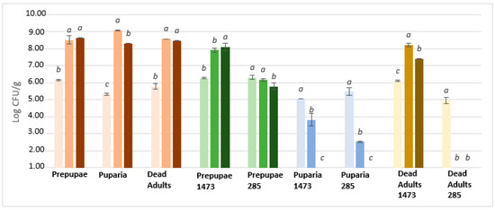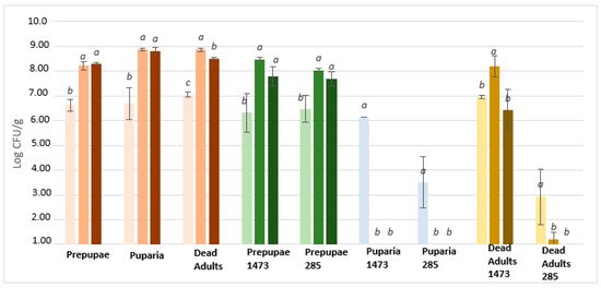 | Puparia | 7.19 ± 0.28 | 9.36 ± 0.10 | 2.17 | 7.15 ± 0.64 | 9.11 ± 0.29 | 1.96 |