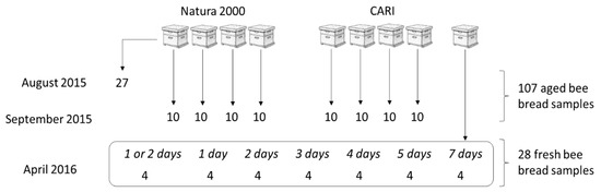 Two apiaries in Belgium were sampled: a private apiary located in a Natura 2000 zone (sitecode: BE31007C0, sitename: Vallée du Train, https://natura2000.eea.europa.eu) in Chaumont-Gistoux (50.692770, 4.698056) and a research apiary of the Beekeeping Research and Information Centre (CARI), located in a mixed zone with agriculture and small industry in Louvain-la-Neuve (50.662900, 4.624573). Bee bread samples were obtained on three occasions (Figure 1). Samples of 27 pollen-filled cells from one honeycomb frame of the Natura 2000 apiary served to establish the sampling and cultivation methods in August 2015. Ten samples per hive were obtained from four healthy hives in both apiaries in September 2015, and these 80 samples were kept at room temperature for about 20 days to represent aged bee bread. A second series of 28 fresh bee bread samples were obtained from the CARI apiary in April 2016. Two wax foundation frames were introduced into a healthy hive and surveyed daily for pollen-filled cells, which occurred on the second day. The frames were then taken out, and then four pollen-filled cells, considered as day one, were sampled and the frames were stored aseptically at 30 °C to imitate the hive temperature. More sets of four samples were obtained daily until day seven. Samples of days one to three were taken from frame one, and the remaining samples from frame two. Bee bread samples were obtained using a sterile plastic pipette tip, cut to an opening of 3–4 mm, which was pressed into the pollen filling of a wax cell. The majority of the cell’s pollen content was transferred with the tip to a tube, weighed, and suspended in 600 or 750 mL saline.