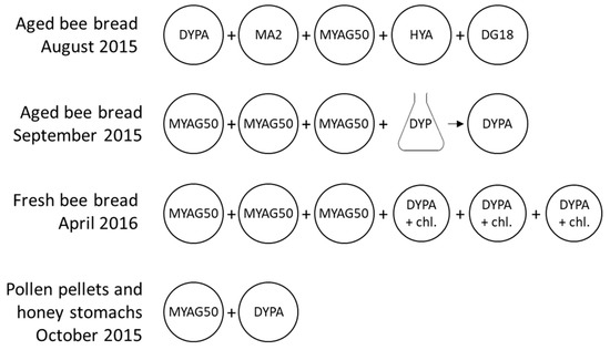 Overview of cultures on Dextrose Yeast Extract Peptone Agar (DYPA), Malt Agar 2% (MA2), Malt Yeast Agar Glucose 50% (MYAG50), Honey Yeast Agar (HYA), Dichloran-Glycerol Agar (DG18), and DYPA with chloramphenicol 200 mgL−1 (DYPA+chl). Single plating was performed to determine the most appropriate media on 27 bee bread samples and on pollen pellets and honey stomachs because of the small sample quantities. Triplicate plating was performed on 80 bee bread samples.