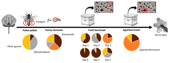 Our sampling of bee-collected pollen pellets and bees’ honey stomachs was intended to detect a possible transmission route of yeasts to the bee bread during transfer and storage of pollen. The detection of some bee bread yeasts in those materials allows for the possibility that Starmerella and Zygosaccharomyces enter the stored pollen either from the floral environment or from the bees’ honey stomach and were enriched in bee bread, but the low sample numbers prevent us from drawing conclusions. Metschnikowia cf. pulcherrima, detected in pollen pellets, and Metschnikowia rancensis, detected in pollen pellets and honey stomachs, were not the typical bee-vectored nectarivorous Metschnikowia species with a Palaearctic distribution, namely M. reukaufii and M. gruessii [71,72,73]. Within the large Metschnikowia clade, sub-clades often show a remarkable ecological and geographic specialisation and are found almost exclusively in association with floricolous beetles. The species reported in the present study belong to a sub-clade that is often encountered in fruit and associated insects. However, both species are less specialised and occur also in nectar, flowers, plant exudates, decayed wood, and nitidulid beetles [73]. Metschnikowia was detected as one of the most common fungal genera in honey bee guts by high-throughput sequencing [74]. The study indicated that bee-pathogen pesticides potentially alter the gut community structure, for example, by reducing the portion of Saccharomycetes versus other fungi.