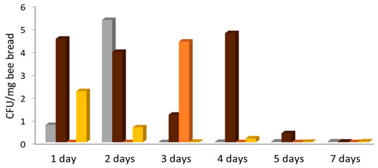 The microbial activity in bee-collected pollen has been evidenced by viable cell counts of maximal 105 bacterial colony-forming units (CFU) per gram of bee bread [13], which is lower compared to other spontaneously occurring mixed lactic acid–yeast fermentations such as in cocoa processing, with 108 to 109 CFU/g [17], likely because of the low water activity in pollen. The microbial succession in honey-bee-collected pollen reported by [18] showed maximum yeast counts of 12 CFU/g at 24 h and 48 h and a lactic acid bacteria peak at 48 h in the same magnitude as reported by [13], eventually terminating in a microbially inactive pollen. Yeasts have been observed in bee bread in far lower cell densities than bacteria and have shown a peak during the first week of storage [18,19]. Only one species, Starmerella (Candida) magnoliae, occurred consistently in pollen pellets and bee bread of up to 6 weeks in age, but not in floral pollen, suggesting that bees may have added this species to the pollen and the conditions during pollen storage selected for its survival [19].
