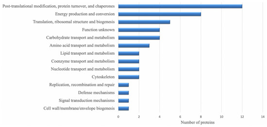 A total of 48 DRPs (78.7%) identified by proteomics analysis, were classified into 14 COG categories, among which “post-translational modification, protein turnover, chaperones” represented the largest group (group O, 12 DRPs), followed by “energy production and conversion” (group C, 8 DRPs) and “translation, ribosomal structure and biogenesis” (group J, 5 DRPs) (Figure 2, Table S5).