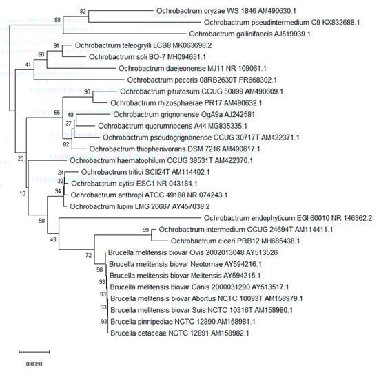 - Velasco, J.; Romero, C.; López-Goñi, I.; Leiva, J.; Dĩaz, R.; Moriyón, I. Evaluation of the relatedness of Brucella spp. and Ochrobactrum anthropi and description of Ochrobactrum intermedium sp. nov., a new species with a closer relationship to Brucella spp. Int. J. Syst. Bacteriol. 1998, 48, 759–768. [Google Scholar] [CrossRef]
