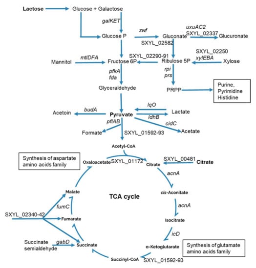 The main carbohydrate in the dairy matrix is lactose. Its initial concentration was 113.4 mM and it slightly decreased during incubation. Only 7.5 mM of lactose was consumed by S. xylosus after 48 h of incubation; lactate and acetate were not detected, and pH did not vary. Interestingly, similar results were observed for S. aureus grown in milk or in cheese, with very low or no consumption of lactose and no detection of lactate and acetate [25,27]. Like S. aureus, S. xylosus, however, has the genetic potential to assimilate lactose via a system composed of two genes, lacP and lacH, which, respectively, encode a lactose permease and a β-galactosidase, which hydrolyzes lactose to glucose and galactose [34,35]. A lacR regulatory gene is positioned upstream of the operon and oriented opposite to the lacPH operon [34]. In our conditions, lacR was underexpressed (Table 1), which might have resulted in low and constitutive lacPH expression in S. xylosus as previously observed [34]. The lacPH expression was also subject to carbon catabolite repression mediated by CcpA encoded by ccpA overexpressed in our study at 48 h (Table 1) which might explain the low expression of lacPH in our conditions. Apart from lactose related genes, we found several genes encoding phosphoenolpyruvate-dependent sugar phosphotransferase systems (PTS) that were highly overexpressed with the cluster SXYL_00773-76 coding for the mannitol transport system and another uncharacterized cluster SXYL_00255-260 (Table 1). The operon galKET was overexpressed at 24 h of incubation. It encodes enzymes involved in the degradation of galactose to glucose 1-P. Then, in our conditions, glucose 1-P could be further metabolized via the pentose phosphate (PP) and pentose/glucoronate interconversion pathways as shown by 15 genes overexpressed in these pathways (Table 1, Figure 1).