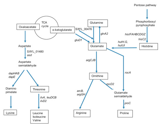The pathway of lysine and branched-chain amino acids synthesis from aspartate is shown in Figure 2. Six genes encoding enzymes involved in the synthesis of lysine were overexpressed. The first two, asd and SXYL_01480, were involved in the catabolism of aspartate to aspartate semialdehyde, and the four others were involved in the formation of diaminopimelate, which will further lead to lysine (Table 1, Figure 2). A cluster of 4 genes (ilvA, leuDCB) and the gene ilvD2 encoded enzymes involved in valine, leucine, and isoleucine formation from threonine, were all up-regulated (Table 1, Figure 2).