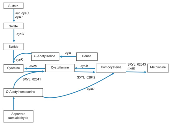 Scheme of synthesis pathways of cysteine and methionine by Staphylococcus xylosus in solid dairy matrix showing the overexpressed genes (the level of expression of these genes and the name of the corresponding enzymes are given Table 1).