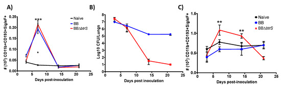 Our prior transcriptomic analysis of macrophages exposed to wild-type Bb or BbDbtrS strains revealed that Bb suppresses the production of IL-33, IL-25, CXCL10, and other factors associated with inflammation [55]. Based on these results, we hypothesized that btrS mediates the modulation of inflammatory cell recruitment and activation in the respiratory tract [55]. To investigate this possibility, we inoculated C57BL/6J mice with the wild-type strain of Bb, and, at different time points, we enumerated bacterial and immune cell numbers in the lungs and spleen. Bb numbers rose rapidly, as expected, and this infection increased eosinophil (CD11b+CD193+SiglecF+ cells) numbers in the spleen, slightly, by day three, and over three-fold by day seven (Figure 1A), coinciding with the peak of bacterial numbers (Figure 1B). However, eosinophil numbers were only slightly increased in the lungs (Figure 1C), despite the large numbers of bacteria there (Figure 1B). The large increase in spleen but not at the site of infection suggested respiratory infection results in a substantial increase in eosinophil numbers produced in the spleen, but Bb somehow interferes with their recruitment to the lungs.