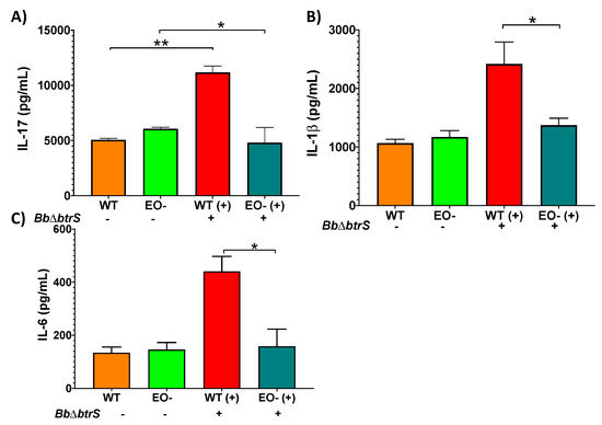 Eosinophil-deficient mice failed to secrete IL-17, IL-1β, and IL-6. Groups of mice were intranasally challenged with 50 μL of PBS, or PBS containing 5 × 105 BbDbtrS; they were euthanized on day 7 (A,B) or 14 (C) post-challenge, and trachea was collected and homogenized, to perform ELISA. The graphs show the average and SEM. * p < 0.05 and ** p < 0.01, using two-way ANOVA. n = 6.