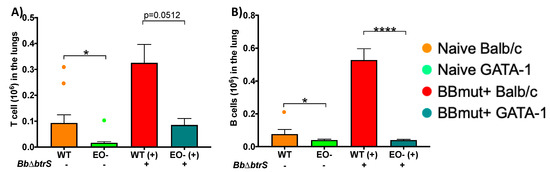 The markedly different cytokine profiles produced by these two different mouse strains suggest that B- and T-cell recruitment might be modulated by eosinophils. It is known that eosinophils can present viral antigen to CD8 T cells [48], and there is evidence that they also modulate B cells [75,76]. Moreover, the modulatory effect of eosinophils in B and T cells can be observed even in naïve uninfected mice [48,75,77]. We have previously reported that the T- and B-cell numbers in the lungs of WT mice were at least twice as high on day 14 post-challenge with BbDbtrS as in WT mice challenged with Bb [55]. To examine the effect of eosinophils on the substantial T- and B-cell recruitment induced by BbDbtrS, we inoculated this strain into WT or EO- mice. T-cell numbers were substantially higher in WT Balb/c mice by day 14 post-infection, as in C57BL/6J mice (Figure 1), while in EO- mice, there were smaller numbers that increased modestly with infection but were still substantially lower than uninfected WT (Figure 4A). B-cell numbers were recruited to the lungs by BbDbtrS in even higher numbers in WT Balb/c mice, but their numbers were unchanged by this severe infection in EO- mice (Figure 4B). While in the wild-type mice the numbers of B cells nearly tripled by 14 days post-challenge, in eosinophil-deficient mice, B-cell numbers remained much lower and did not change measurably in response to 14 days of infection. This substantial defect in the recruitment of B cells to the lungs of EO- mice suggests that eosinophils are critical to the robust local B-cell response to this infection.