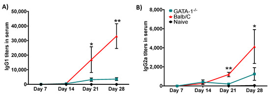 Eosinophil-deficient mice failed to generate protective antibodies. WT or EO mice were intranasally challenged with 50 μL of PBS or PBS containing 5 × 105 BbDbtrS, in two independent experiments. At different days, mice were euthanized, and serum was collected to perform ELISA, to evaluate anti-Bb antibody titers (results are the average of two independent assays in triplicate). IgG1 (A) and IgG2a (B) were evaluated. The data are shown as average and SEM; * p < 0.05 and ** p < 0.01, using Student t-test. n = 6.