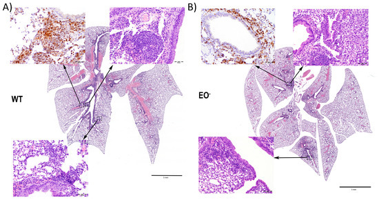 Eosinophil-deficient mice were deficient in generating organized BALT. Groups of 6 Balb/cJ (WT) (A) and GATA-1 (EO-) (B) mice were intranasally challenged with 50 μL of PBS containing 5 × 105 BbDbtrS, and, at day seven post-challenge, lungs were fixed in 10% formalin solution for hematoxylin and eosin staining. Scale bar = 3 mm. n = 6.