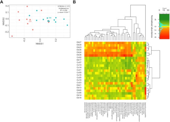 The bacterial transcriptome in Obese (OB) and Lean (CO) subjects. (A) Nonmetric multidimensional Scaling (NMDS) ordination of variance stabilized counts of bacterial RefSeq nonredundant proteins for CO (n = 11) and OB (n = 12) samples, compared using Bray–Curtis dissimilarity. The plot shows a higher heterogeneity in the case of obese samples and an overlapping region between the two groups, including four CO and three OB samples. The permutation analysis of variance (PERMANOVA) and corresponding R-squared and p-values, reported inside the plot, indicate a significant separation of the two classes. The Red and Cyan dots indicate CO and OB samples, respectively. (B) The heatmap-of-variance stabilized counts of bacterial RefSeq nonredundant proteins resulted in significant differences (p < 0.05, Log2FC > |1|) using DESeq2 differential analysis between the OB and CO groups. The Euclidean distance was calculated and the Ward’s method was used for hierarchical clustering, both for rows and columns, as shown on top and right sides of the heatmap. Two distinct clusters are observable for the two classes, indicating that most of the functions were more highly expressed in the OB group. A third cluster (at the bottom) was composed of mixed samples from the two groups.
