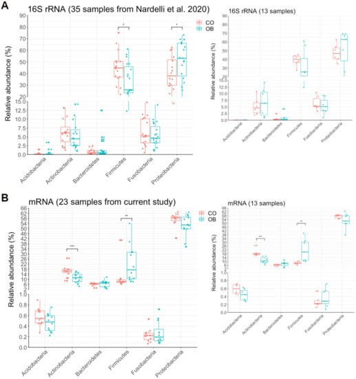 Phyla abundances in Obese (OB) and Lean (CO) subjects obtained by 16S rRNA sequencing and inferred from transcriptomic data. The boxplots show the relative abundances of phyla obtained through 16S shotgun sequencing performed in our previous study (Nardelli et al., 2020) (A) and inferred by the mRNA gene abundances in the current study (B), containing 35 and 23 samples, respectively. Among these, 13 patients (6 CO and 7 OB) were analyzed in terms of both 16S rRNA and transcriptomics and are shown by the right smaller plots. The middle line in the boxes represents the median, lower box bounds represent the first quartile, and upper box bounds represent the third quartile. Whiskers represent the 95% confidence interval of the mean. The significance of distribution differences was calculated by applying the Kruskal–Wallis test and Benjamini-Hochberg p-value adjustment (* p < 0.05; ** p < 0.01; *** p < 0.005). The Red and Cyan boxplots indicate control and obese samples, respectively.