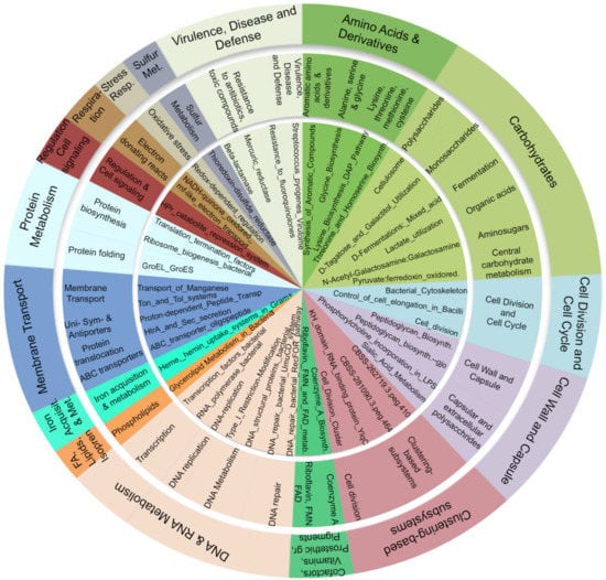 SEED subsystem hierarchy. The level 3 terms of SEED subsystem database (shown in the inner circle of the figure) resulted significant up-expressed genes (p < 0.05, Log2FC > 1) between Lean (CO, n = 11) and Obese (OB, n = 12) samples using DESeq2 differential abundance analysis. Terms were then grouped according to their belonging to higher levels 2 (middle circle) and 1 (outer circle). The slices size is proportional to the Log2FC values. The figure shows that the most altered functions concern the Amino acids, Carbohydrates, and Nucleic acids metabolism; the Clustering-based subsystem; the Virulence, Disease, and Defense mechanisms; and the Membrane transport.