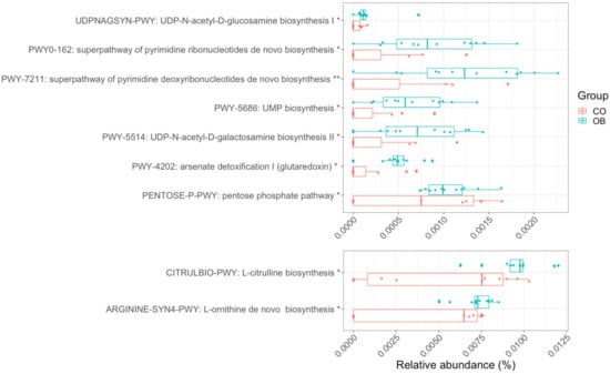 MetaCyc microbial processes associated with obesity (q < 0.1) detected using the MaAsLin2-generalized linear model. The significance was calculated after adjusting for age and gender effects. The x-axis shows the relative abundances. Boxplots were made with R function boxplot with default settings (whiskers extend 1.5-times the interquartile range). (*: 0.05 < q < 0.1: **: 0.01 < q < 0.05). Red and Cyan boxplots indicate Lean (CO, n = 11) and Obese (OB, n = 12) samples, respectively.