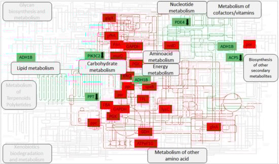 Human and microbial genes mapped into metabolism roadmap. The figure shows the metabolic pathways involving the differentially expressed genes between Obese (OB) and Lean (CO). The SEED subsystem L4 (Supplementary File 3) and human genes differentially expressed between the two groups (Table 1 and Supplementary File 4) were converted into KEGG orthologs Ids and mapped to the human metabolism using iPath3. The pathways related to the matched orthologs are highlighted to identify convergent paths between host and bacteria, colored in green and red, respectively. The genes which found one or multiple matches are also shown and highlighted by the corresponding colors. The genes reported in the figure were all up-expressed in OB vs CO, except a few which were down-expressed, indicated by an arrow in the box (n=4). Whole gene names and corresponding EC numbers are reported below in “Abbreviations” section.